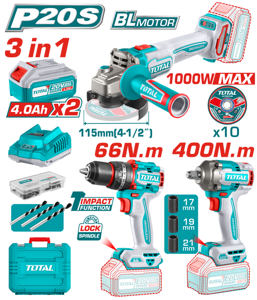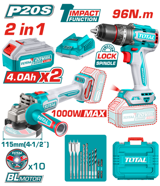 طقم دريل وصاروخ شحن بدون أسلاك من توتال 20 فولت مع محرك برشلس من Total