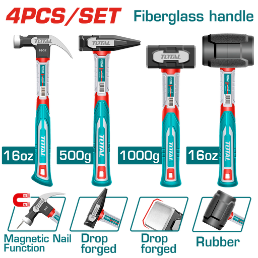 طقم مطارق TOTAL من 4 قطع بمقابض ألياف زجاجية لامتصاص الصدمات