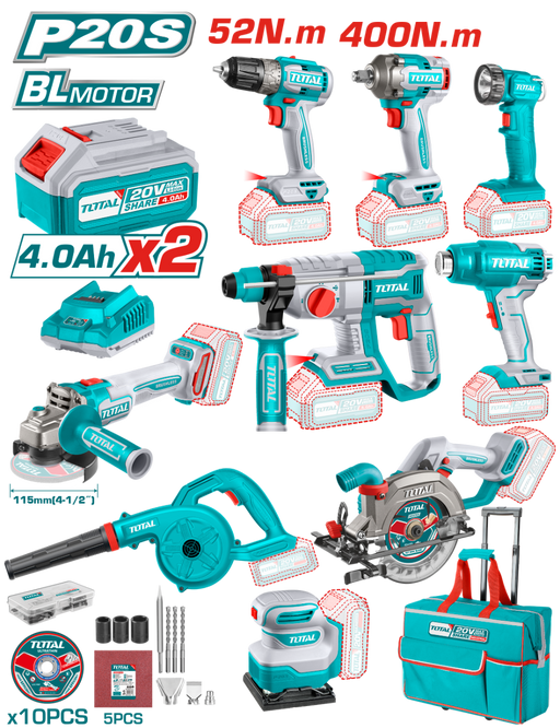 Product Name in Arabic: TOTAL 9-Piece Charging Tool Set Product Name in English: Total 9 Pcs Cordless Industrial Combo Kit (TCKLI2098) Country...