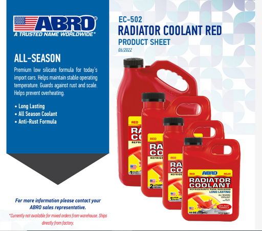 Product Name in Arabic: ABRO Red Radiator Coolant (Gallon) Product name in English: Red Radiator Cooler EC-502 ABRO Country of Origin: USA ...
