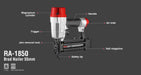 مسدس مسامير هوائي احترافي RONIX RA-T50 خفيف الوزن وقوي بهيكل من الألمنيوم المصبوب ومجلة تحميل جانبي؛ يعمل بالهواء المضغوط لتجميع الخشب بسرعة ونظافة، مناسب لمشاريع التأطير، التجميع، وأعمال الديكور والخزائن.