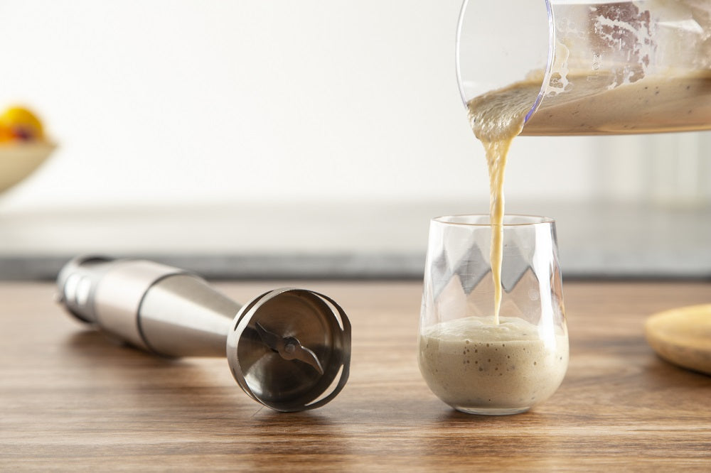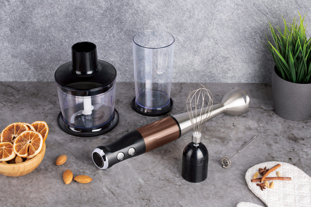- The set consists of: a blender head for crushing ice, a slicer, a whisk, a whisk cup, and a milk whisk.