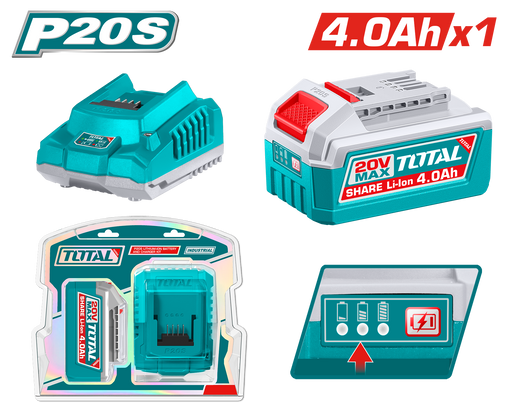 اسم المنتج بالعربي: مجموعة شاحن وبطارية ليثيوم أيون 4.0AH من TOTAL P20S - 20V مع شاحن سريعاسم المنتج بالإنجليزي: TOTAL P20S Lithium-Ion 4.0Ah Batte...