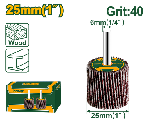 اسم المنتج بالعربي: عجلة طلاء JADEVER 25x25x6mm، حبيبات 40#، مثالية للرمل الدقيق والمعدناسم المنتج بالإنجليزي: JADEVER Flap Wheel with Shaft – 25x2...