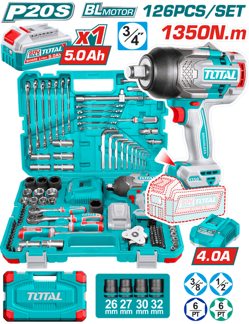 اسم المنتج بالعربي: طقم مفك تأثير بدون سلك 126 قطعة 1350Nm من THKTHP31262 بسرعات متغيرةاسم المنتج بالإنجليزي: TOTAL 126 Pcs Cordless Impact Wrench ...