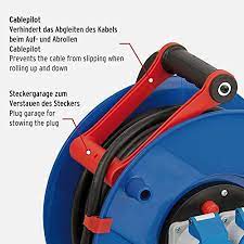- The cable reel comes with a CEE 2P+E plug with an IP44 water and dust resistance rating, making it suitable for use in harsh environments and difficult conditions in industrial sites and workshops.