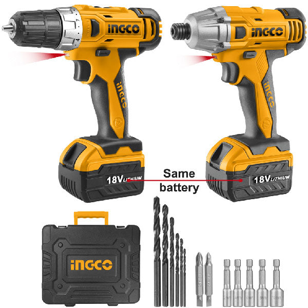 • A set containing an 18-volt lithium charging drill + an 18-volt screw tightening drill
