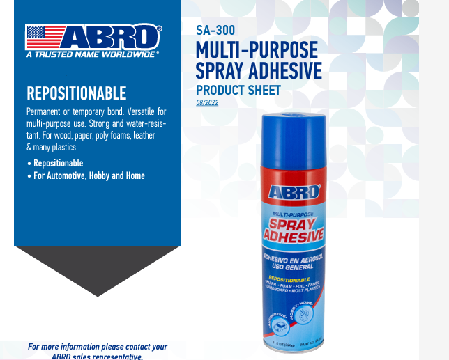 - Versatile: ABRO SA-300 Spray Adhesive can be used on a variety of surfaces, including wood, paper, plastic foam, leather, and many other types of plastic.