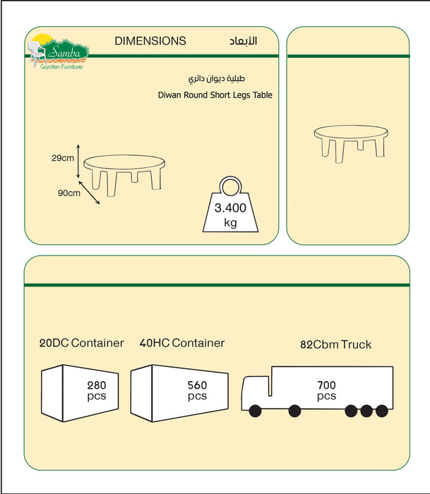 Brief Description of General Features: A circular table designed to meet floor seating needs in an elegant and practical manner. Its height and variety of colors make it the perfect choice for any social or family occasion.