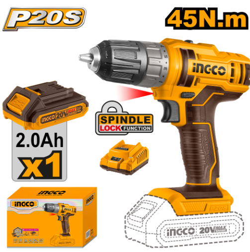 اسم المنتج بالانجليزي: INGCO 20V Lithium-ion Cordless Drill with Battery and Charger CDLI200518