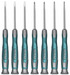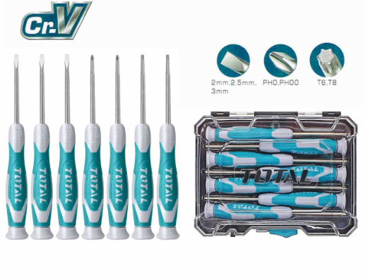 يتكون الطقم من 7 مفكات الكترونية مختلفة الأحجام والأشكال تستخدم في تثبيت وفك المسامير الدقيقة دون التسبب في تلف الأجزاء الإلكترونية الحساسة.