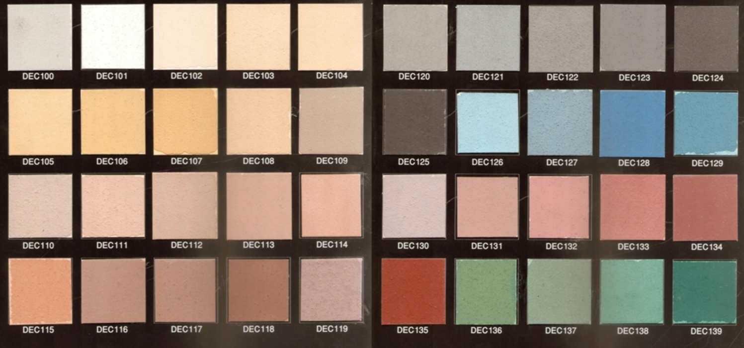 يتوفر Deco Plaster 103 في مجموعة متنوعة من الألوان. تتوفر ألوان خاصة أيضًا وفقًا للحد الأدنى من كميات الطلبات والرسوم الإضافية. لمزيد من التفاصيل راجع مخطط ألوان Decorete®.
